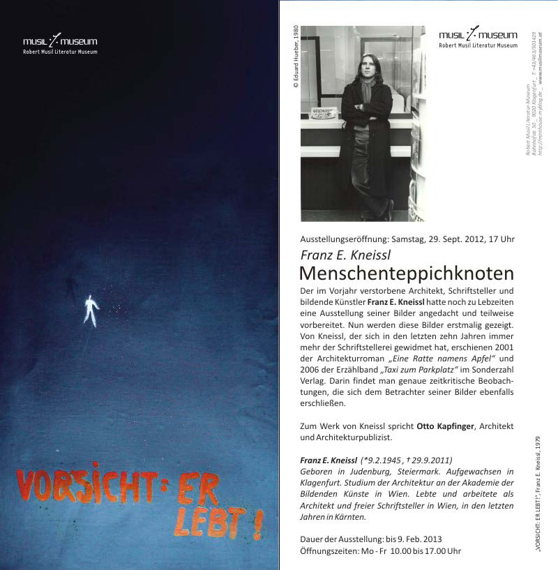Der im Vorjahr verstorbene Architekt, Schriftsteller und bildende Künstler Franz E. Kneissl hatte noch zu Lebzeiten eine Ausstellung seiner Bilder angedacht und teilweise vorbereitet. Nun werden diese Bilder erstmalig gezeigt. Von Kneissl, der sich in den letzten zehn Jahren immer mehr der Schriftstellerei gewidmet hat, erschienen 2001 der Architekturroman “Eine Ratte namens Apfel” und 2006 der Erzählband “Taxi zum Parkplatz” im Sonderzahl Verlag. Darin findet man genaue zeitkritische Beobachtungen, die sich dem Betrachter seiner Bilder ebenfalls erschließen.